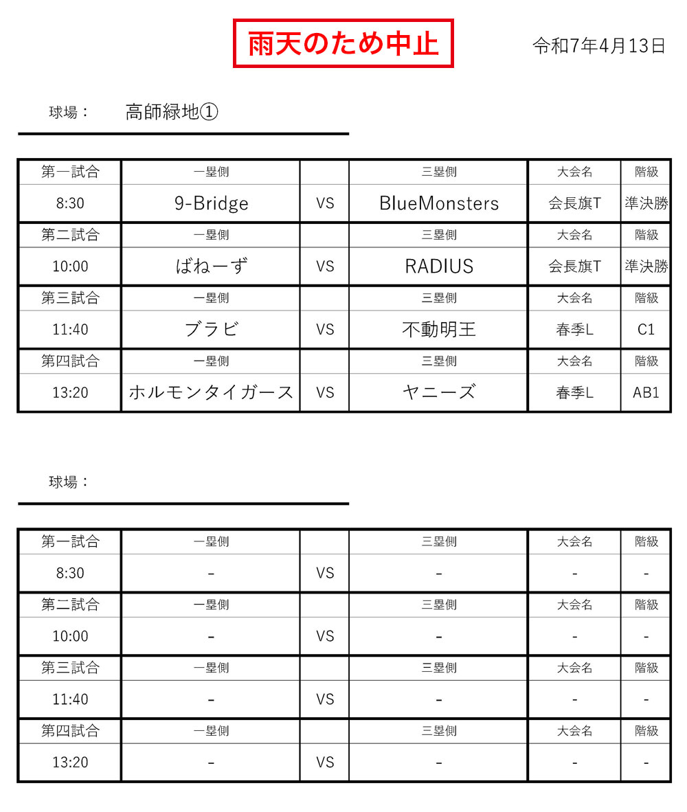 2025年04月13日の試合は、雨天のため全試合中止となりました。