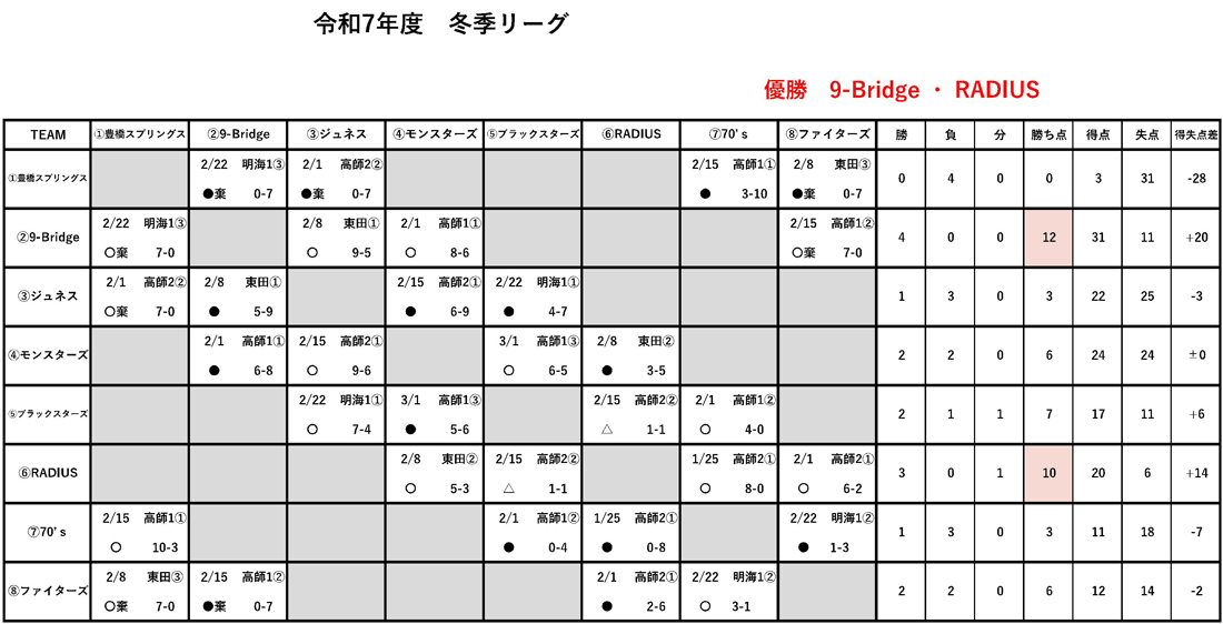 「令和7年 冬季リーグ戦」の最終結果です。