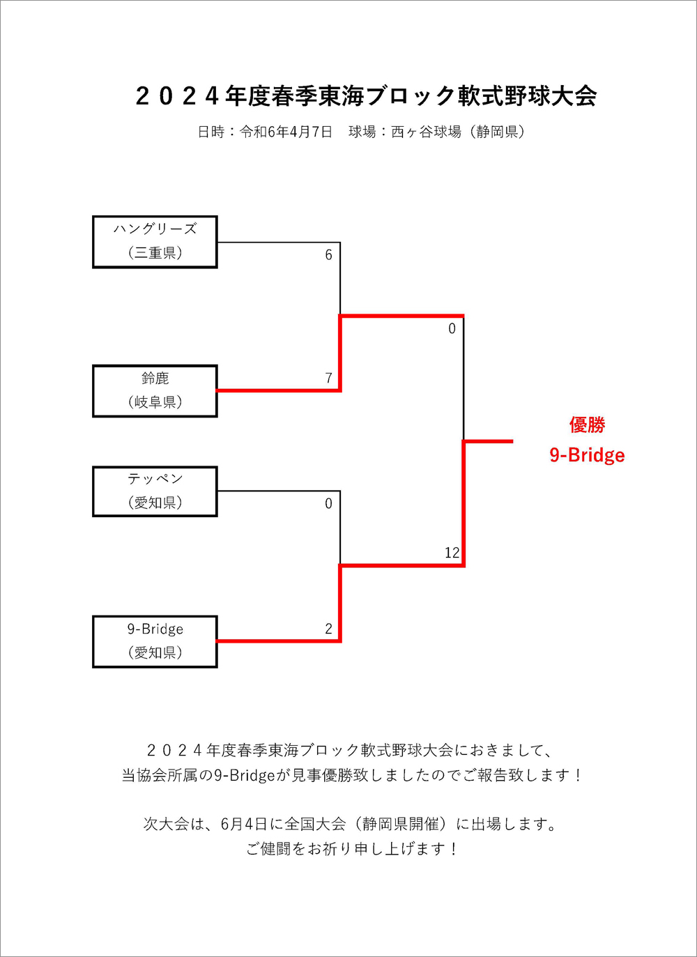2024年度春季東海ブロック軟式野球大会におきまして、 当協会所属の9-Bridgeが見事優勝致しましたのでご報告致します!